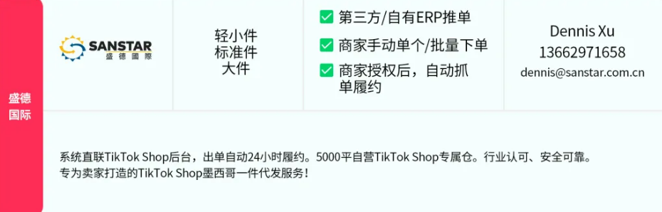 TikTok Shop墨西哥开仓!盛德国际成首批“官方管家”,助你躺赢!发表时间:2025-08-19 17:35 ![]() 随着TikTok Shop墨西哥跨境自运营(POP)模式的全面开启,中国跨境商家迎来了拓展墨西哥市场的绝佳契机。这就像一道为中国卖家量身定制的“任意门”,直通潜力巨大的拉美市场。我们盛德国际很荣幸,能够成为TikTok Shop首批“平台展示第三方墨西哥本地仓”服务商之一,致力于为广大商家提供高效、可靠的本地仓储与发货解决方案。 ![]() 01 盛德国际:您在墨西哥的“超级管家”! 作为TikTok Shop官方推荐的本地仓服务商,我们会凭借专业的运营资质和丰富的物流经验,为您的商品在墨西哥的顺畅流通保驾护航。我们深知时效与安全是跨境物流的核心,因此,我们始终将这两点作为服务宗旨,确保您的货物能够高效、安全地送达消费者手中。 ![]() 02 下单无忧,货型通吃:我们就是这么灵活! 在处理货型方面,无论是轻巧的小件商品,还是标准尺寸的日常用品,甚至是体积较大的包裹,我们都能提供专业的仓储和操作服务。 为了让您的订单处理更省心,我们支持多种下单方式,任您选择: · ERP系统轻松推单:您可以通过第三方/自有ERP系统,像点外卖一样轻松推单。 · 手动下单随心所欲:喜欢亲力亲为?没问题!手动单个或批量下单,灵活又自由。 · 自动抓单“躺平”履约:授权后,我们甚至能实现自动抓单履约,让您真正“躺平”收钱,把繁琐的物流环节交给盛德国际! ![]() ![]() 我们理解商家对于货物安全和派送时效的重视。盛德国际我们在墨西哥拥有本地自营仓库、高风险路段配合联邦警察护送、出货即赠商保“上架险”,保价至平台仓,为卖家提供安全与时效的双重保障!我们致力于优化每一个物流环节,让您的墨西哥业务从此告别“掉链子”的烦恼,一路顺畅! ![]() 声明:此篇为「盛德国际」墨西哥海外仓-空海运专线物流-跨境电商快递原创文章,转载请标明出处链接:https://www.sanstar.net.cn/tkshop.html